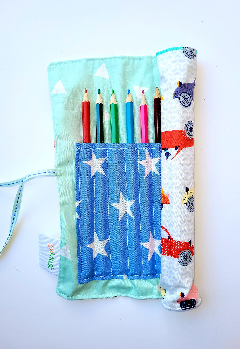 קלמר תפור בעבודת יד עם כיס מחולק ל 12 עפרונות צבעוניים שכיף לקחת לכל מקום.